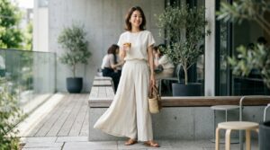 ワンピースやフレアスカートなどガーリーなアイテムに、ベージュやホワイトのスライドサンダルを合わせることで抜け感のある今っぽいコーディネートが完成します。過度に甘くなりすぎず適度なカジュアル感が加わるため、大人の女性らしい着こなしに仕上がります。