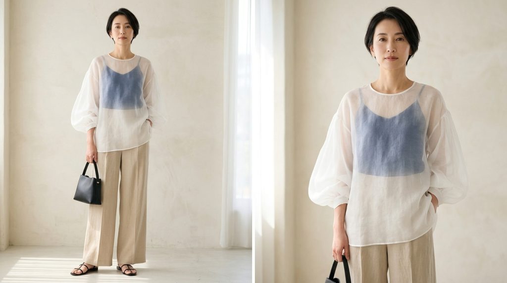 2026春夏の透け感ブラウスは重ね着が鍵!40代の着こなし完全ガイド